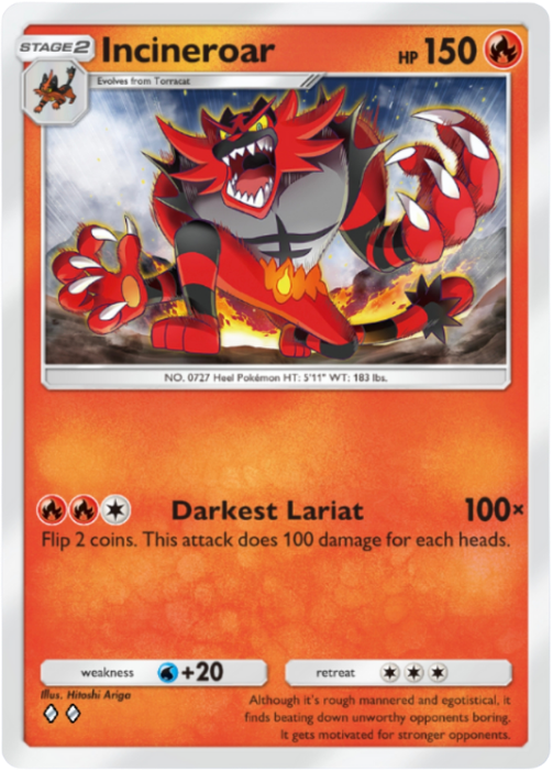 The deck makes full use of Pokémon Communication to get Incineroar ex into play as quickly as possible. It also utilizes Hau to start earning points early in the game.