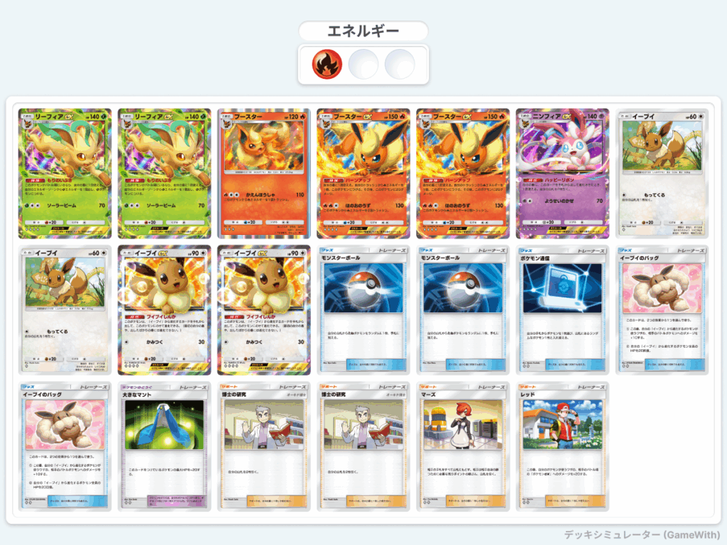 序盤はリーフィアexで攻めてからブースターexの2-2進行。ブースターexのエネルギーはリーフィアexが気絶した時にトラッシュされたエネルギーを使用できるので相性が良い。リーフィアexが序盤に来ないと厳しい。