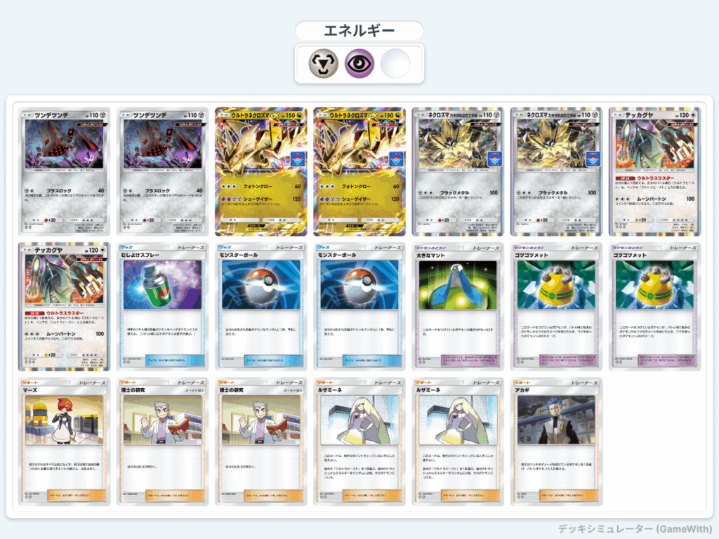 序盤はテッカグヤ・ネクロズマたそがれのたてがみ・ツンデツンデの非exポケモンで耐久してつつ相手ポケモンを倒し終盤でウルトラネクロズマexとマーズを使うことで相手の選択肢をなくします。