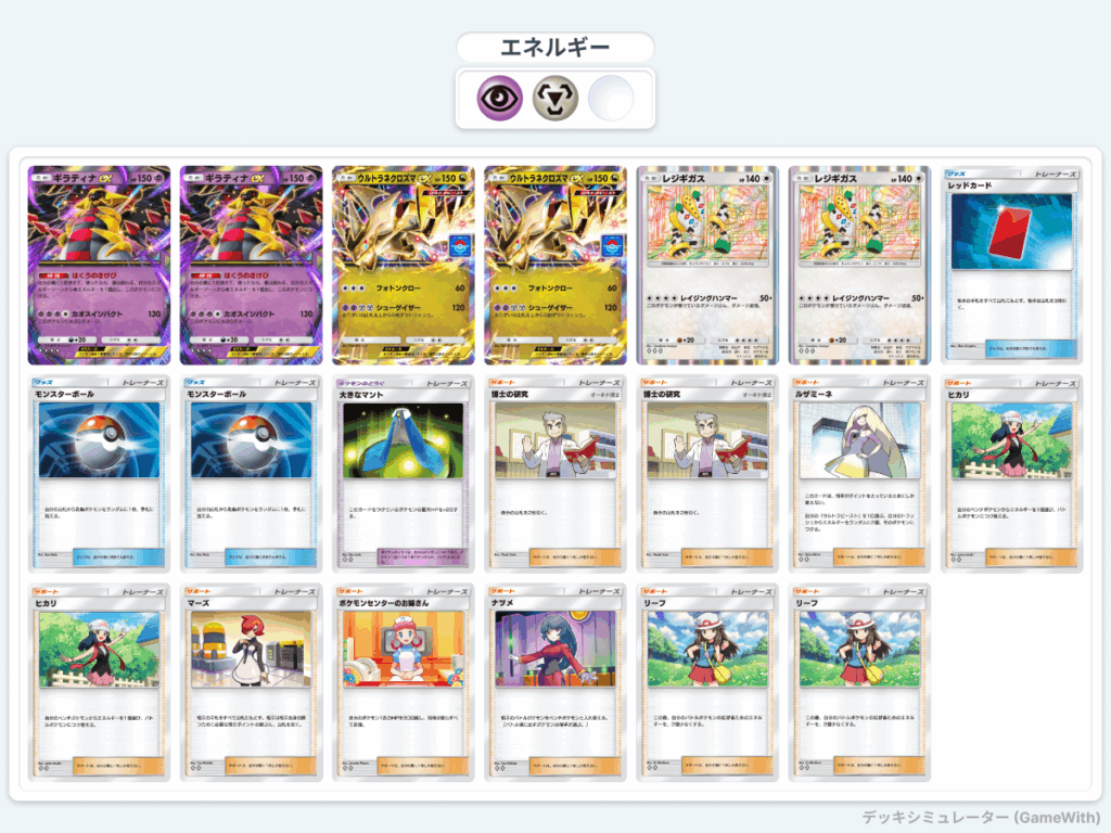 序盤は、ギラティナexでエネルギーを増やしながら後ろでレジギガスやウルトラネクロズマexにエネルギーをつけます。