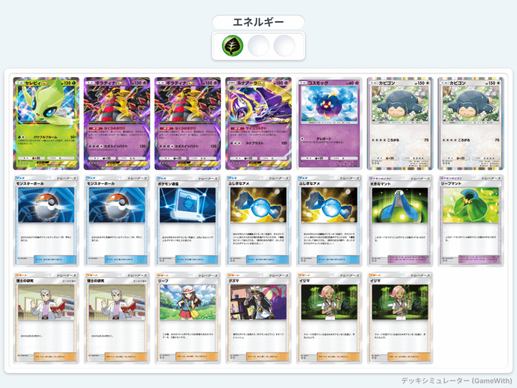 イリマを採用していることからデッキの耐久力の高さがあり、ギラティナexやカビゴンのワザを活かしながらも戦え、相手ポケモンを1ターンで倒し切らないといけない状況に対してもルナアーラexとセレビィexのコンボでコイントス次第ではありますが、大抵のポケモンを倒すことができるデッキ編成となっています。