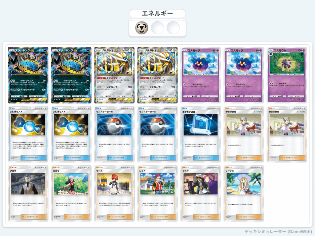 アクジキングexの高耐久と相手のエネルギーをコイントスでトラッシュすることができ、ワザの使用やにげると阻止することができます。そしてソルガレオexのダメージが足りない状況に応じてもアクジギングexの30ダメージが控えている為ダメージが足りない状況も解決しやすい状況を作り出すことができるデッキです。