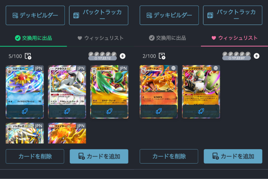 カードを追加を押すとカード名から検索するシステムやパックごとやレアリティでカード絞り込みできる機能もあるので、ぜひ機能を使用して「交換用に出品」と「ウィッシュリスト」にカードを追加してみてください。