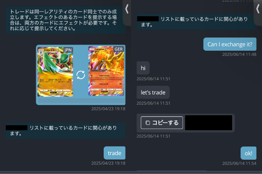 基本的に画像や交換したいカード名を伝えたあとに下の文章を送るとスムーズにやり取りが進みます。