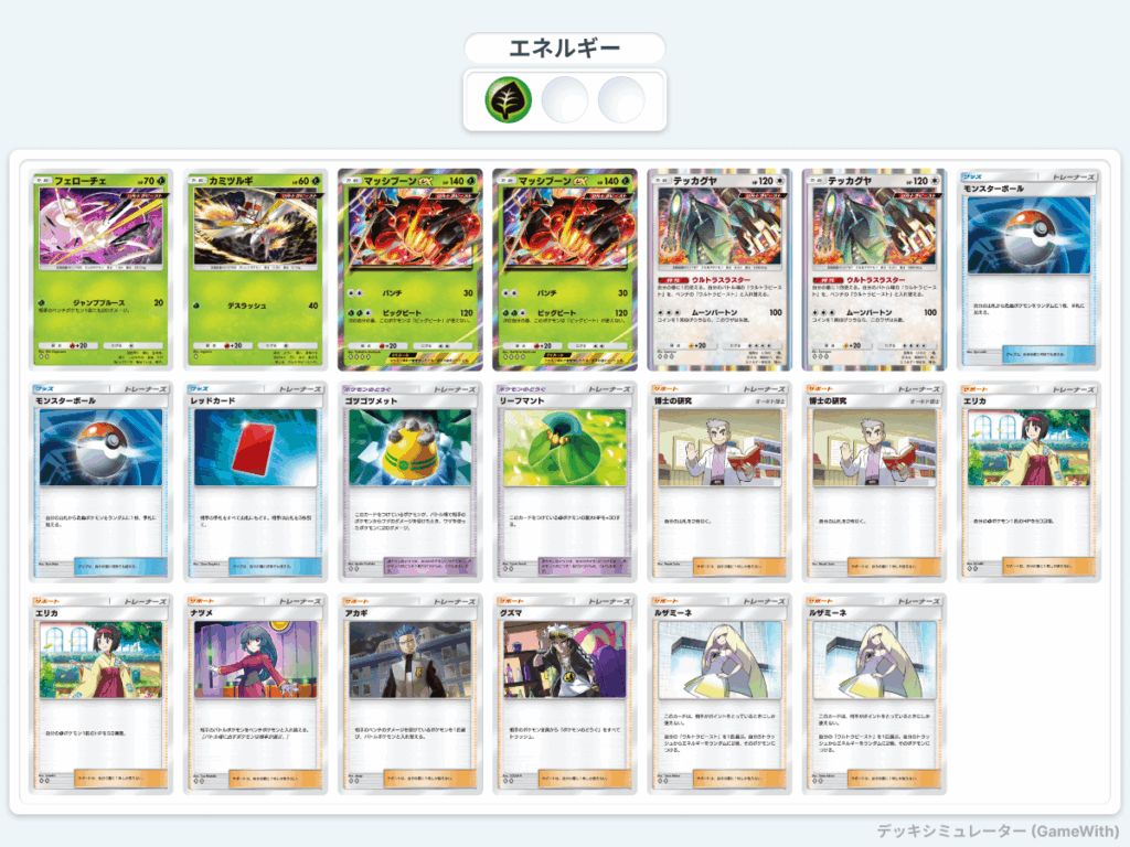 フェローチェ、カミツルギorカミツルギ、フェローチェからマッシブーンexの1-1-2進行。フェローチェとカミツルギで1ポイント獲得かつ相手のベンチにいるexポケモンにフェローチェでダメージを与えておく。マッシブーンexはテッカグヤ2枚の特性を使用して連続で攻撃ができる。