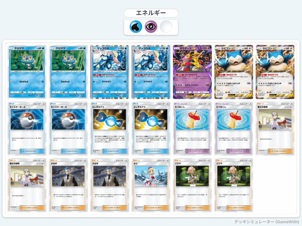 A3シーズンで流行ったカビゴンゲッコウガのexバージョン。立ち回りはほとんど同じだが、カビゴンexの特性とたべのこしのおかげで耐久力が上がり安定してゲッコウガの完成とギラティナexの準備が整いやすくなった。