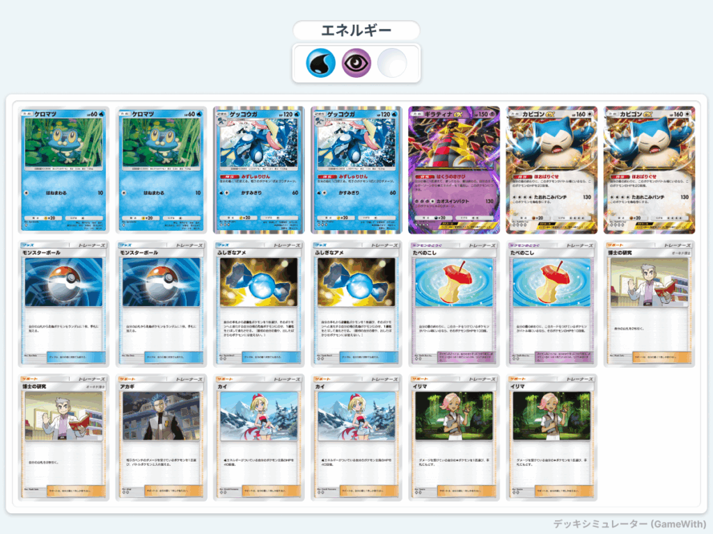 A3シーズンで流行ったカビゴンゲッコウガのexバージョン。立ち回りはほとんど同じだが、カビゴンexの特性とたべのこしのおかげで耐久力が上がり安定してゲッコウガの完成とギラティナexの準備が整いやすくなった。