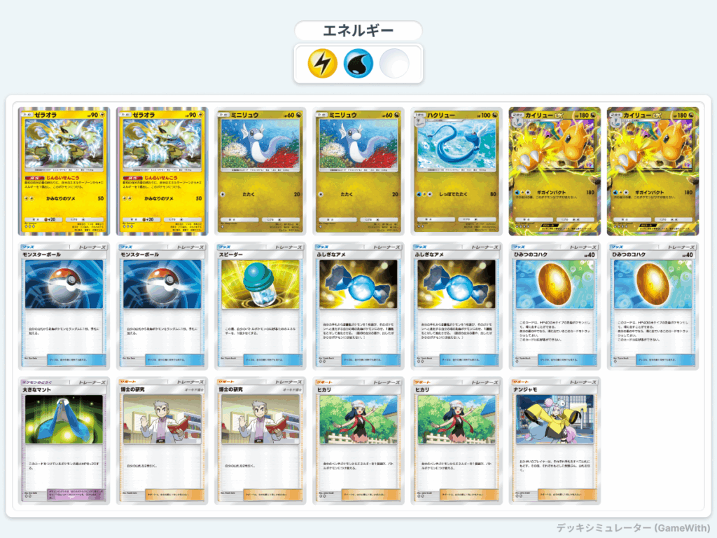 回復リソースは採用していないのでゼラオラをバトル場に出して壁をしつつエネ加速をしたい。カイリューexに進化できるのであればスピーダーでゼラオラをベンチに逃げてヒカリでカイリューexにエネルギーをつけて攻撃する。