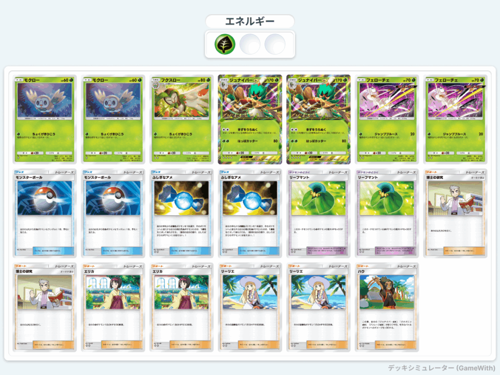 ハウを入れたことでジュナイパーexの火力が上がったがベンチのポケモンには効果がないのでジュナイパーexとそこまで相性の良いカードではない。